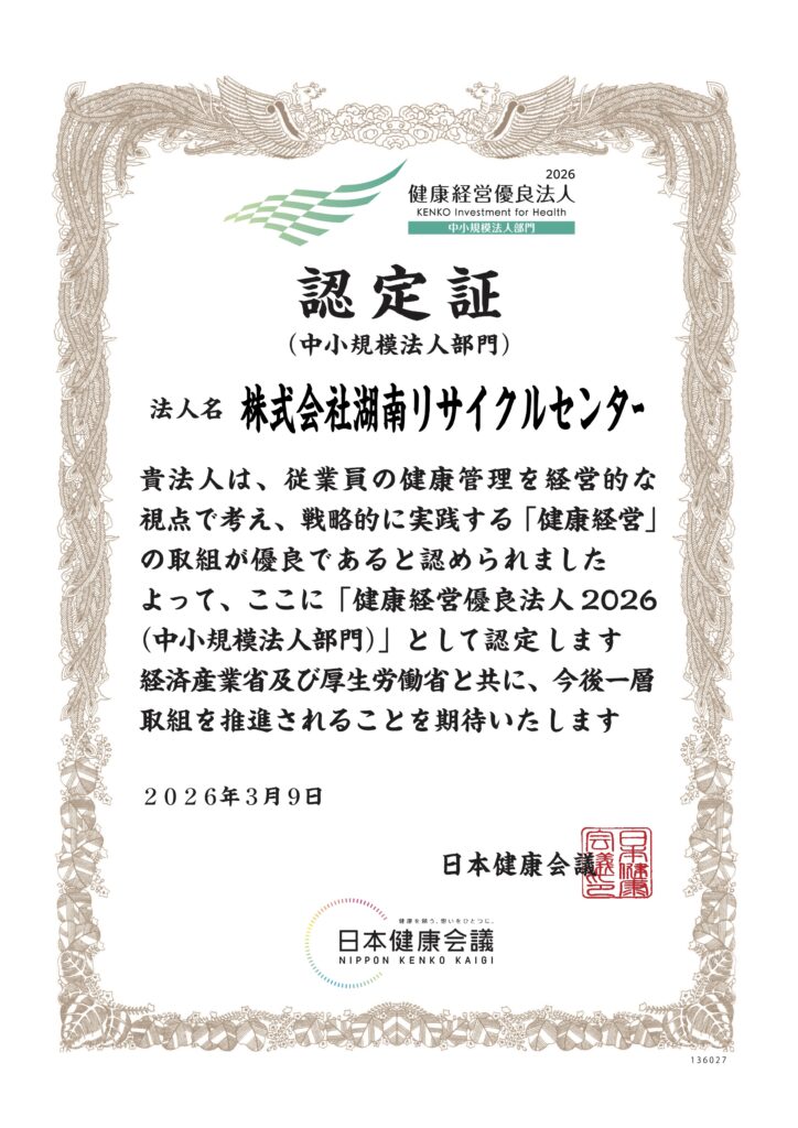 株式会社湖南リサイクルセンターは、2026年3月、経済産業省および日本健康会議が実施する「健康経営優良法人認定制度」において、「健康経営優良法人2026(中小規模法人部門)」に認定されました。